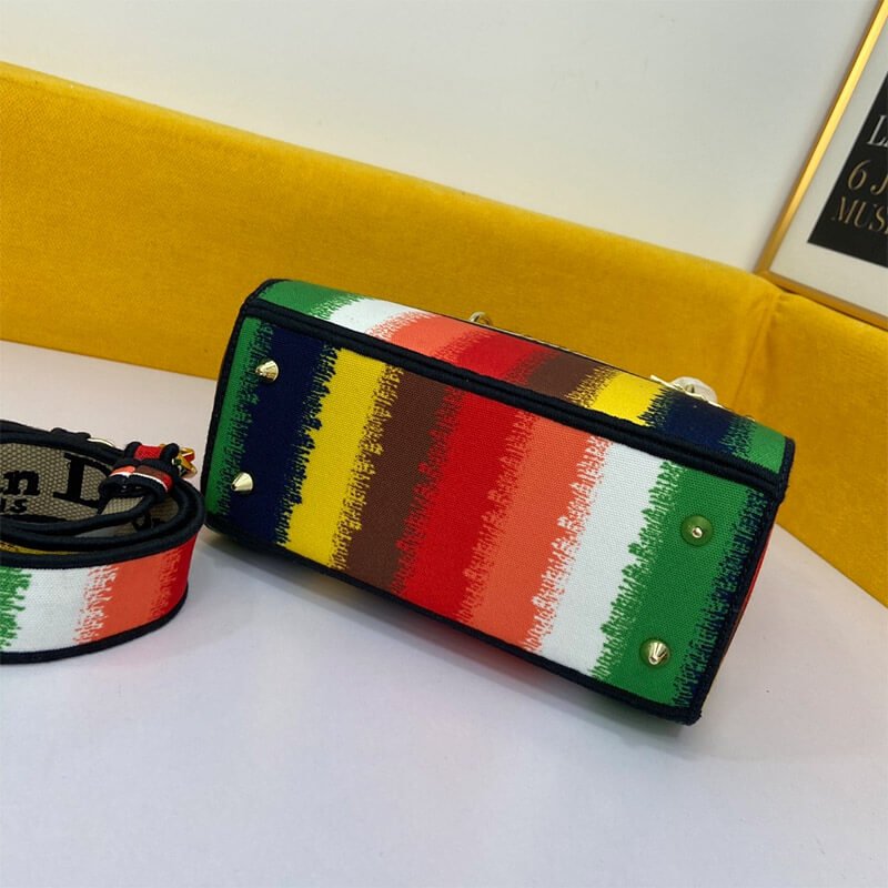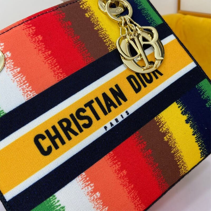 The Lady D-Lite handbag combines classic elegance with the modern feel of the brand. This style brings a new interpretation of the bayadere theme pattern this season. It is decorated with a full-scale multi-color mixed-color effect D-Stripes pattern embroidery, revealing a contemporary atmosphere, and the front is decorated with the ??Christian Dior?? logo. The thick gold-tone metal ??D.I.O.R.?? pendant is infused with pattern style. The medium-sized Lady D-Lite handbag has a wide, detachable double-sided embroidered shoulder strap, which can be carried, shouldered or slanted.