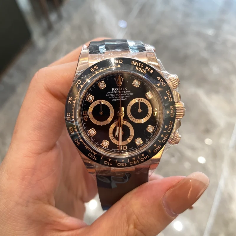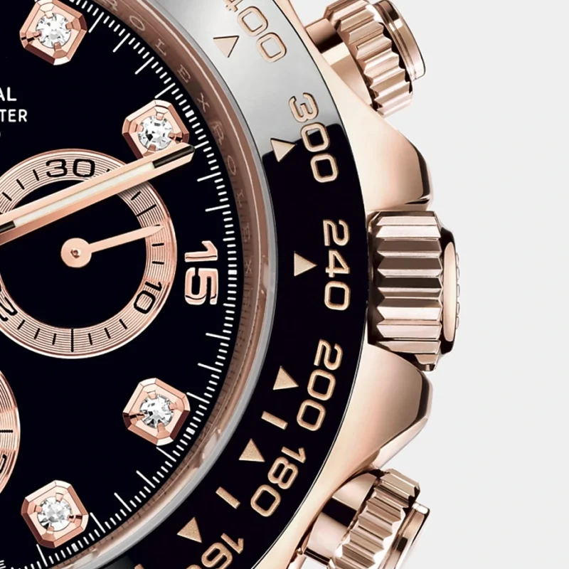 THIS OYSTER PERPETUAL COSMOGRAPH DAYTONA IN 18 KT EVEROSE GOLD WITH A BLACK, DIAMOND-SET DIAL AND AN OYSTERFLEX BRACELET, FEATURES A BLACK CERACHROM BEZEL WITH TACHYMETRIC SCALE.