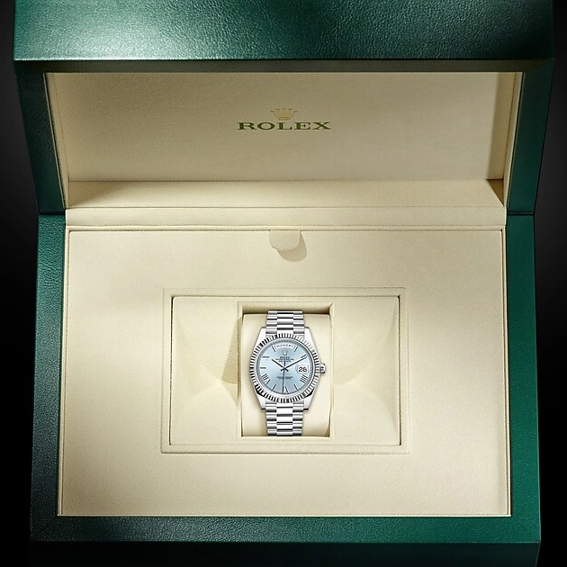 THE OYSTER PERPETUAL DAY-DATE 40 IN PLATINUM WITH AN ICE-BLUE DIAL, FLUTED BEZEL AND A PRESIDENT BRACELET.