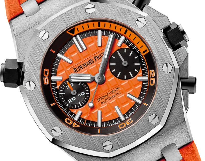 A vibrant Royal Oak Offshore, featuring the original collection trademark design elements and innovative functions. The Royal Oak Offshore Diver Chronograph, an encounter between twho masterstokes: the Diver and the Chronograph. Water-resistant up to 300 meters, the watch features a rotating inner bezel color-blocked with diving scale and zone, subsidiary seconds and 30-minute register.