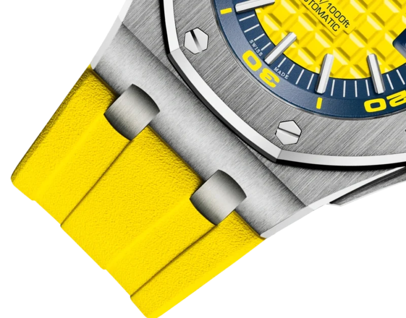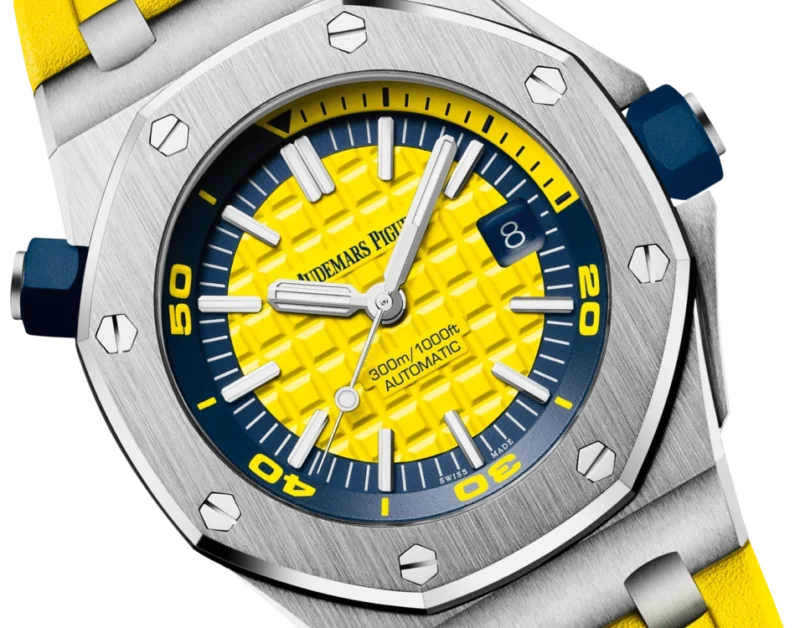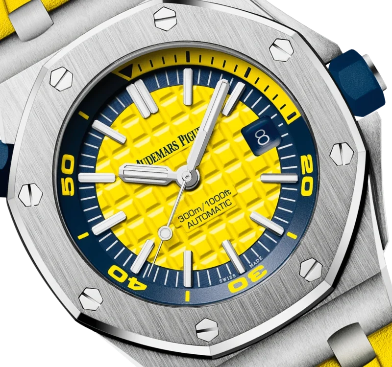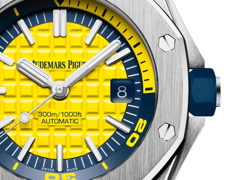 Perfect legibility in and out of the water with this fun and ??funky?? new Royal Oak Offshore Diver. The Royal Offshore??s signature ??M??ga Tapisserie?? checkerboard patterned dial is in bright yellow, harmoniously balanced with a blue rotating inner bezel. Two perfect-fit diving straps are provided, in matching yellow or blue.