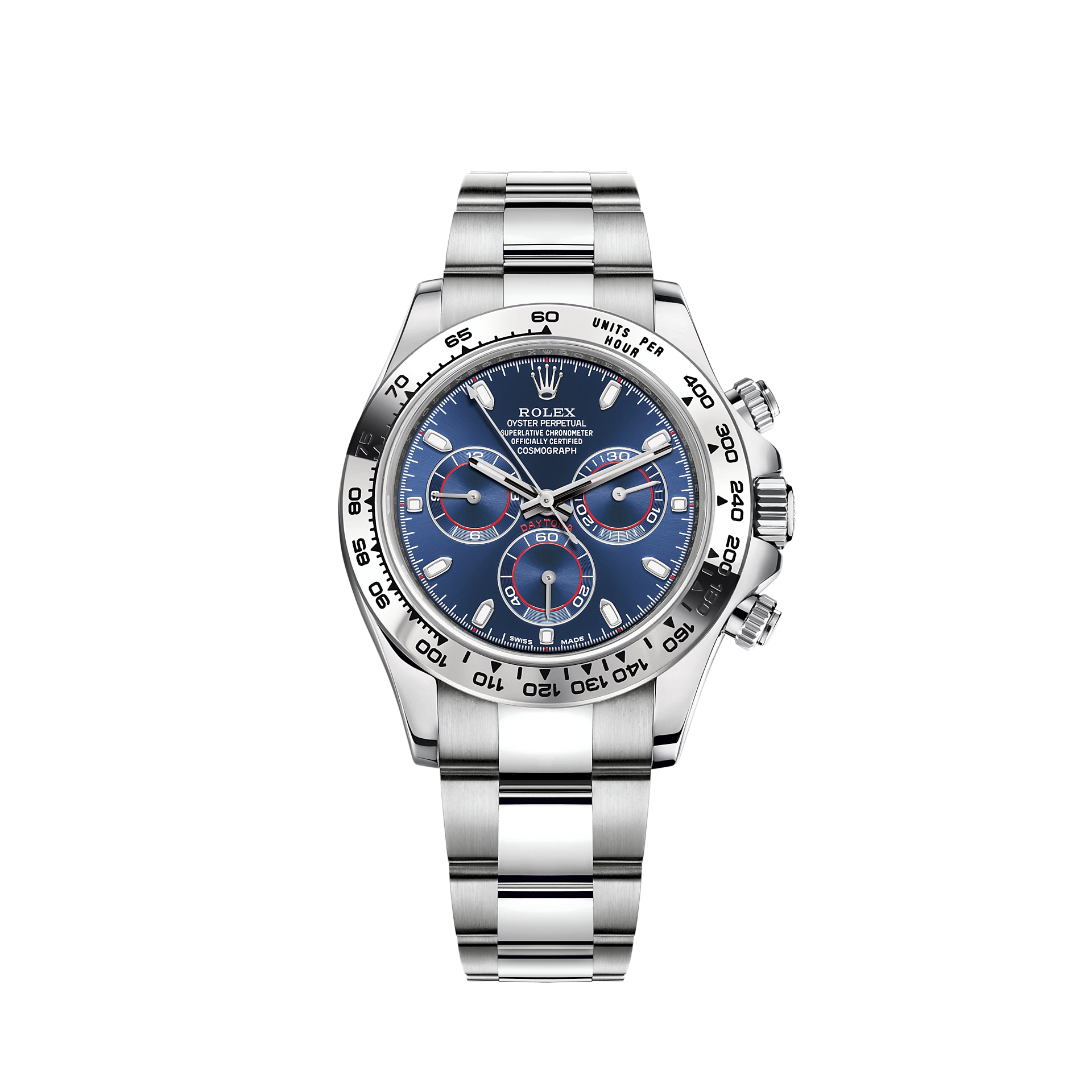 This Oyster Perpetual Cosmograph Daytona in 18 ct white gold, with a bright blue dial and an Oyster bracelet, features an 18 ct white gold bezel with engraved tachymetric scale.