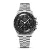Presented on a polished-brushed five-arched-links-per-row bracelet, this 42 mm Moonwatch in stainless steel features sapphire crystal glass on the front as well as on the caseback. Inspired by the 4th generation Speedmaster style worn on the moon, it also includes an asymmetrical case, black step dial with applied OMEGA logo and the famous dot over 90 on the anodised aluminium bezel ring.