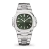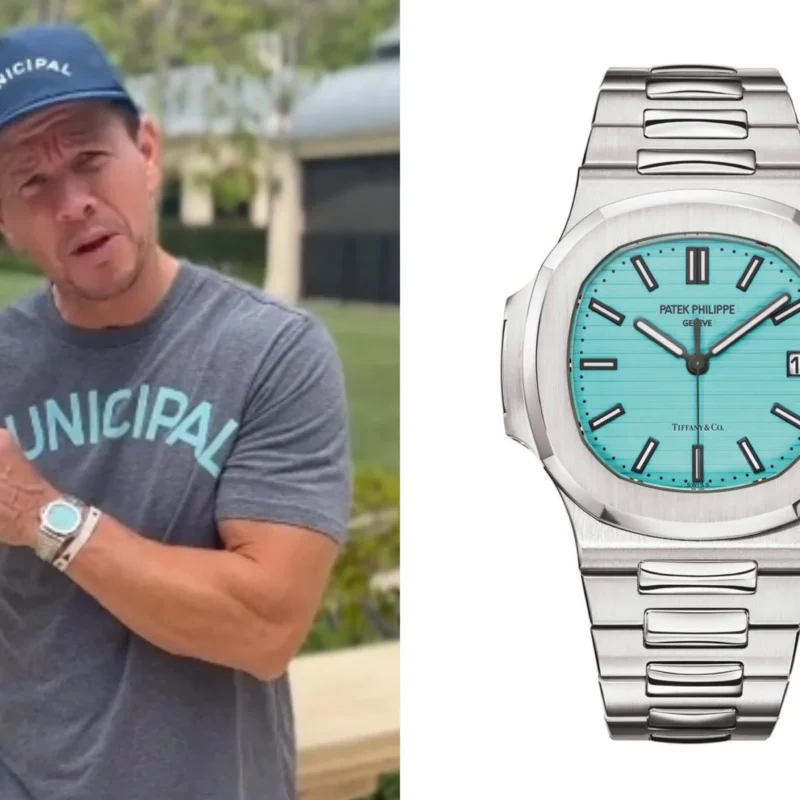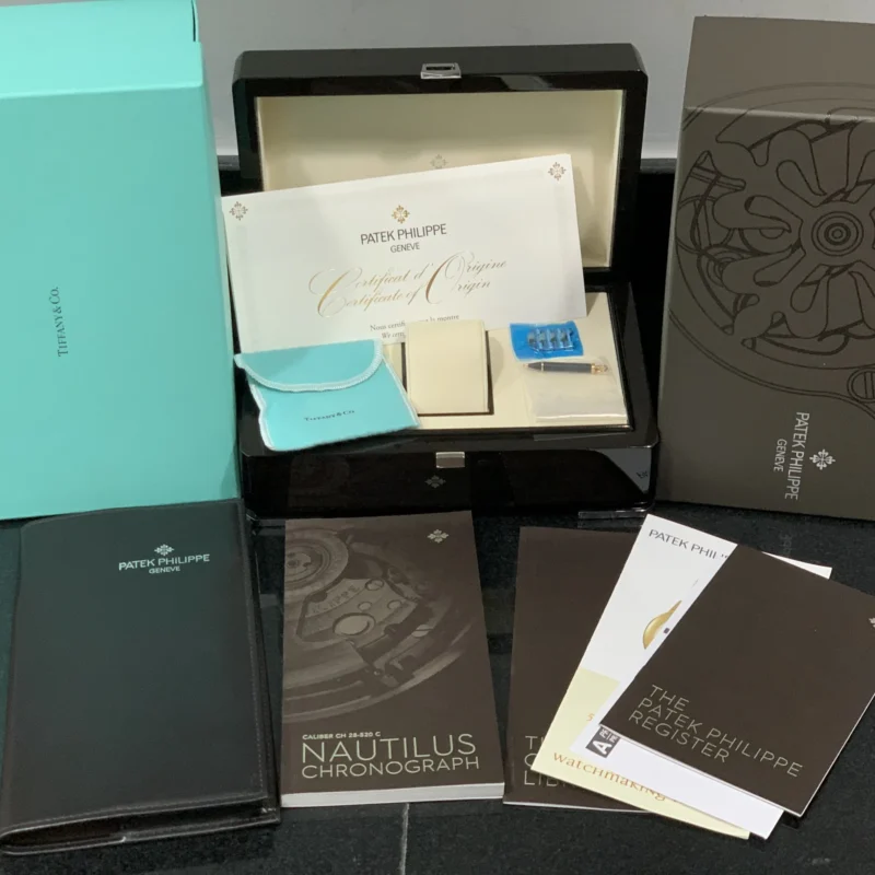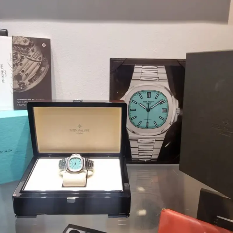 Specifications include a brass dial with Tiffany Blue? lacquer and with horizontal Nautilus embossing, black printed Patek Philippe Gen??ve, and Tiffany & Co. signatures (hence the term double-signed Nautilus), applied hour markers in blackened 18k white gold, a touch of luminous paint and baton-style hands.?