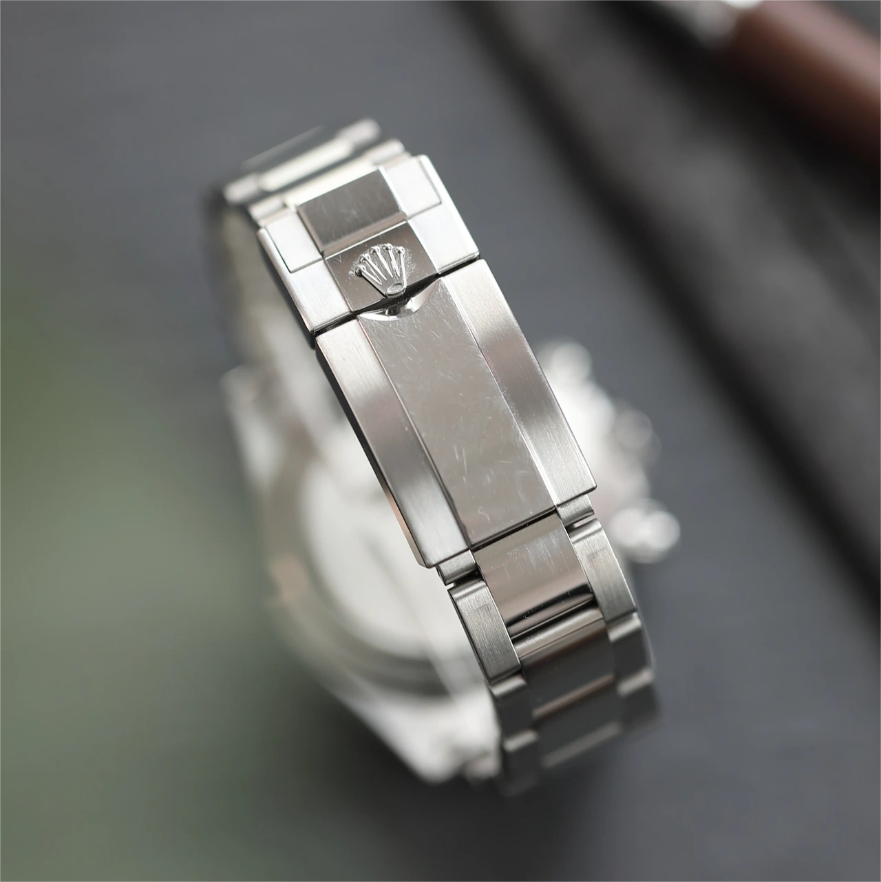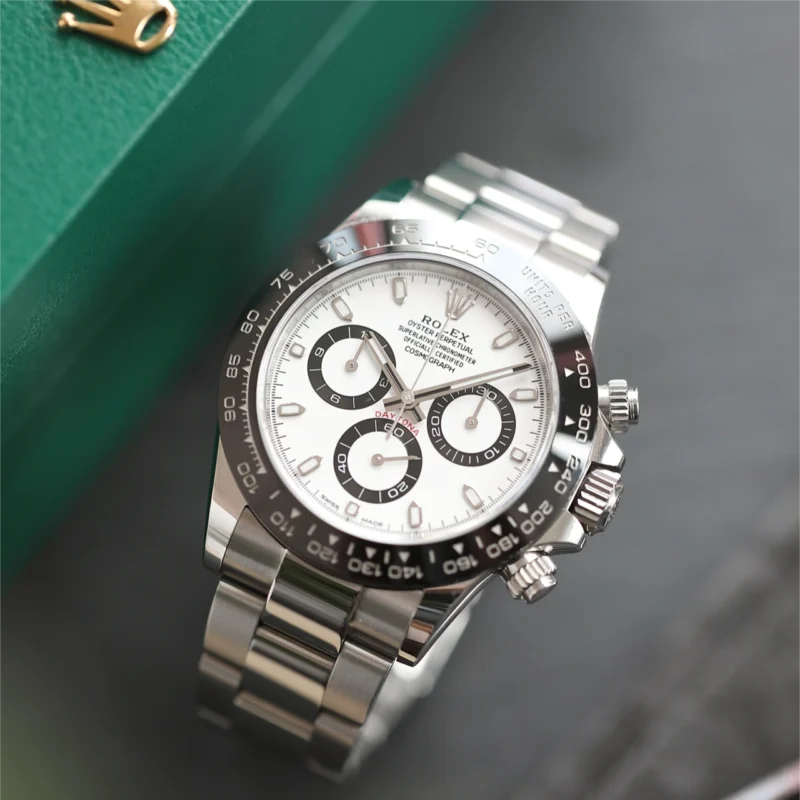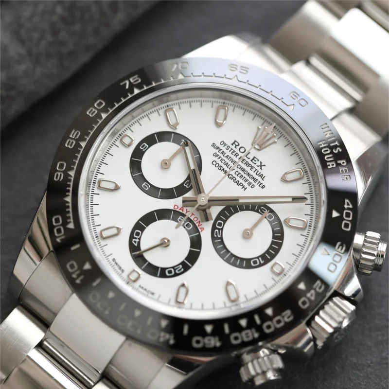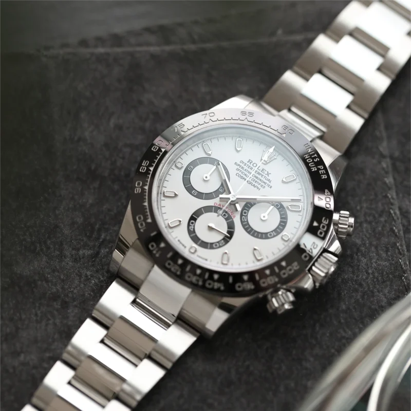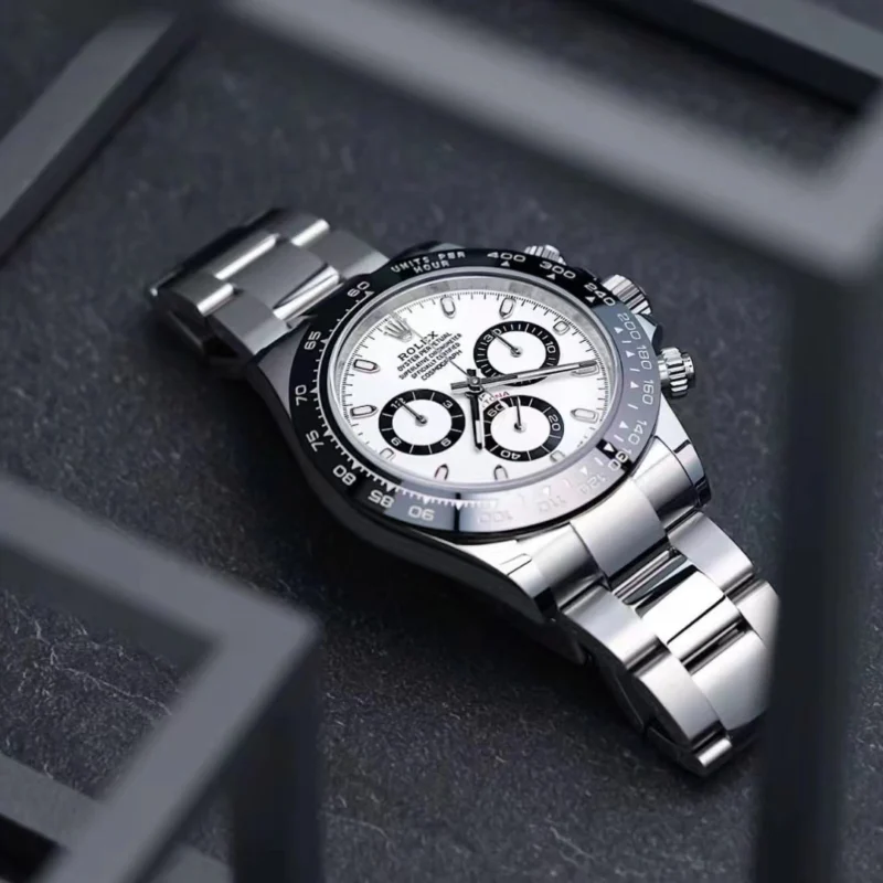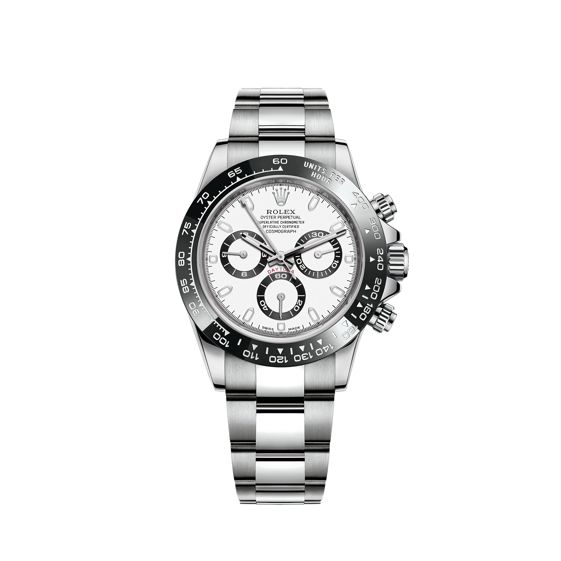 THIS OYSTER PERPETUAL COSMOGRAPH DAYTONA IN OYSTERSTEEL WITH A BLACK DIAL AND AN OYSTER BRACELET, FEATURES A BLACK CERACHROM BEZEL WITH TACHYMETRIC SCALE.