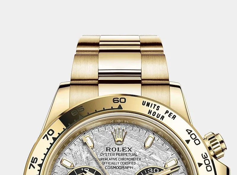 THIS OYSTER PERPETUAL COSMOGRAPH DAYTONA IN 18 KT YELLOW GOLD, WITH A METEORITE AND BLACK DIAL AND AN OYSTER BRACELET, FEATURES 18 KT YELLOW GOLD BEZEL WITH ENGRAVED TACHYMETRIC SCALE.
