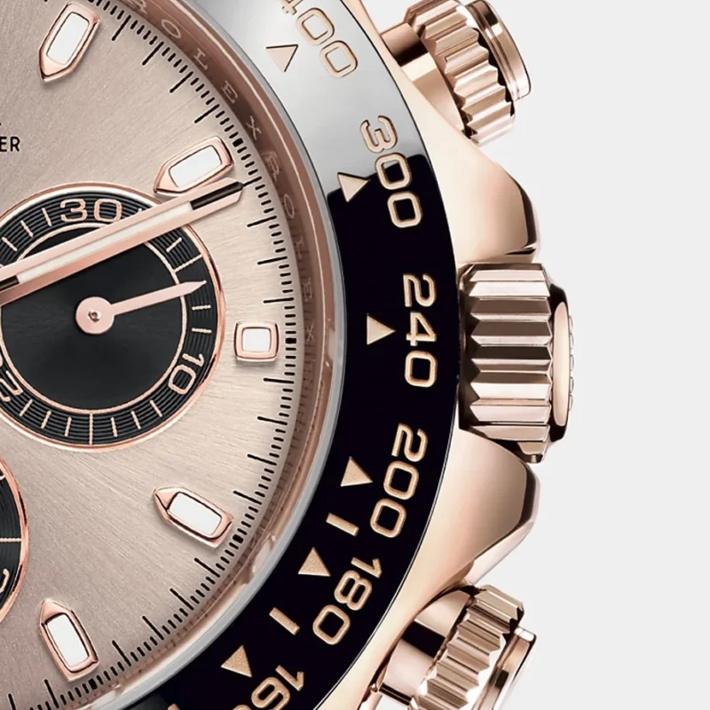 THIS OYSTER PERPETUAL COSMOGRAPH DAYTONA IN 18 CT EVEROSE GOLD WITH A SUNDUST AND BLACK DIAL AND AN OYSTERFLEX BRACELET, FEATURES A BLACK CERACHROM BEZEL WITH TACHYMETRIC SCALE.