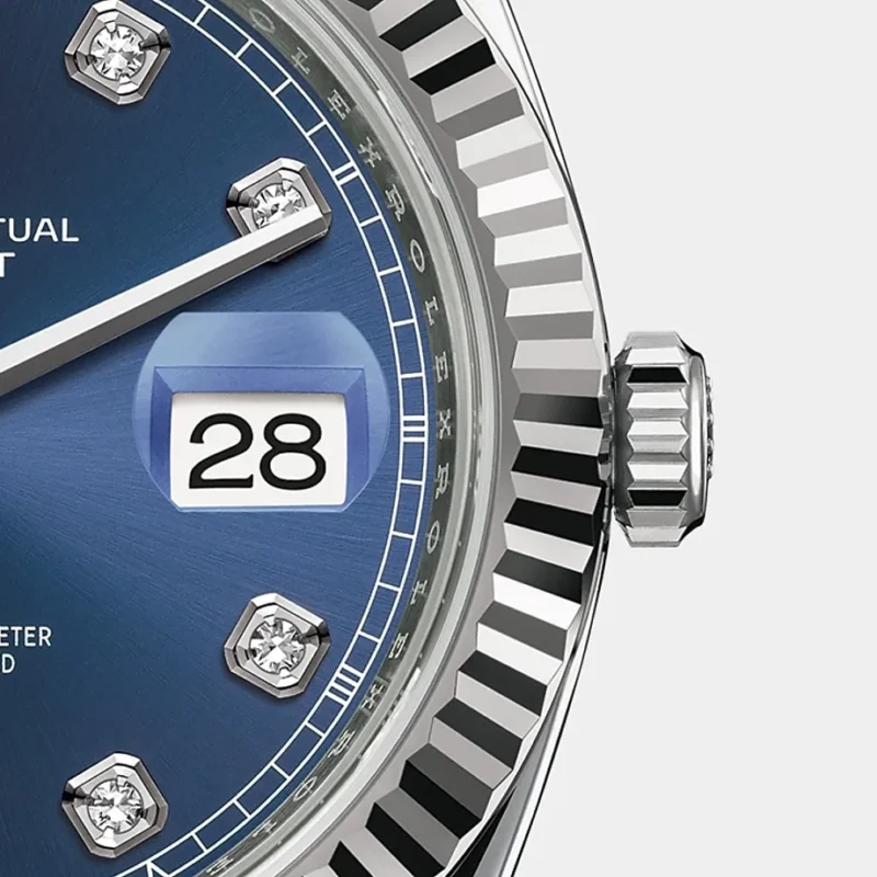 - Scratch-resistant sapphire, Cyclops lens over the date