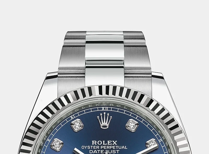 THIS OYSTER PERPETUAL DATEJUST 41 IN OYSTERSTEEL AND WHITE GOLD FEATURES A BRIGHT BLUE, DIAMOND-SET DIAL AND AN OYSTER BRACELET.