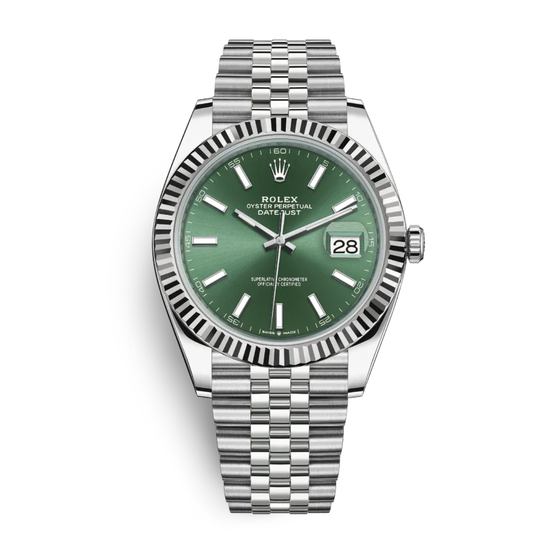 THIS OYSTER PERPETUAL DATEJUST 41 IN OYSTERSTEEL AND WHITE GOLD FEATURES A MINT GREEN DIAL AND A JUBILEE BRACELET.